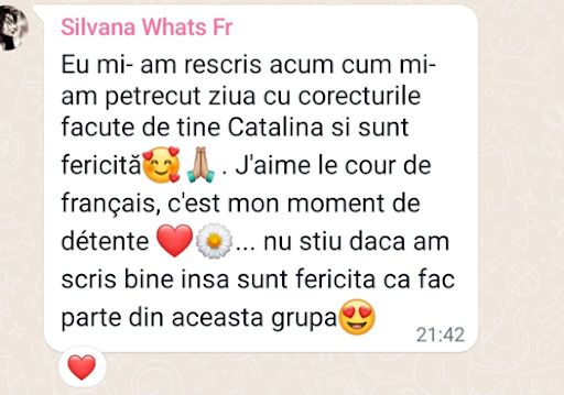 Satisfacția pe care o am atunci când elevii mei reușesc să aibă nivelul dorit în limba franceză este imensă.
